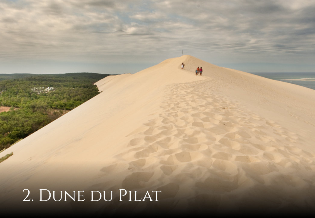 Com cerca de 102 a 110 metros de altura (variando conforme os ventos e a erosão) e quase 3 quilômetros de extensão, a Dune duPilat é a maior duna de areia da Europa. Localizada na região da Aquitânia, próxima a Arcachon, esta montanha de areia dourada contrasta dramaticamente com a floresta de pinheiros de um lado e o oceano Atlântico azul-turquesa do outro.