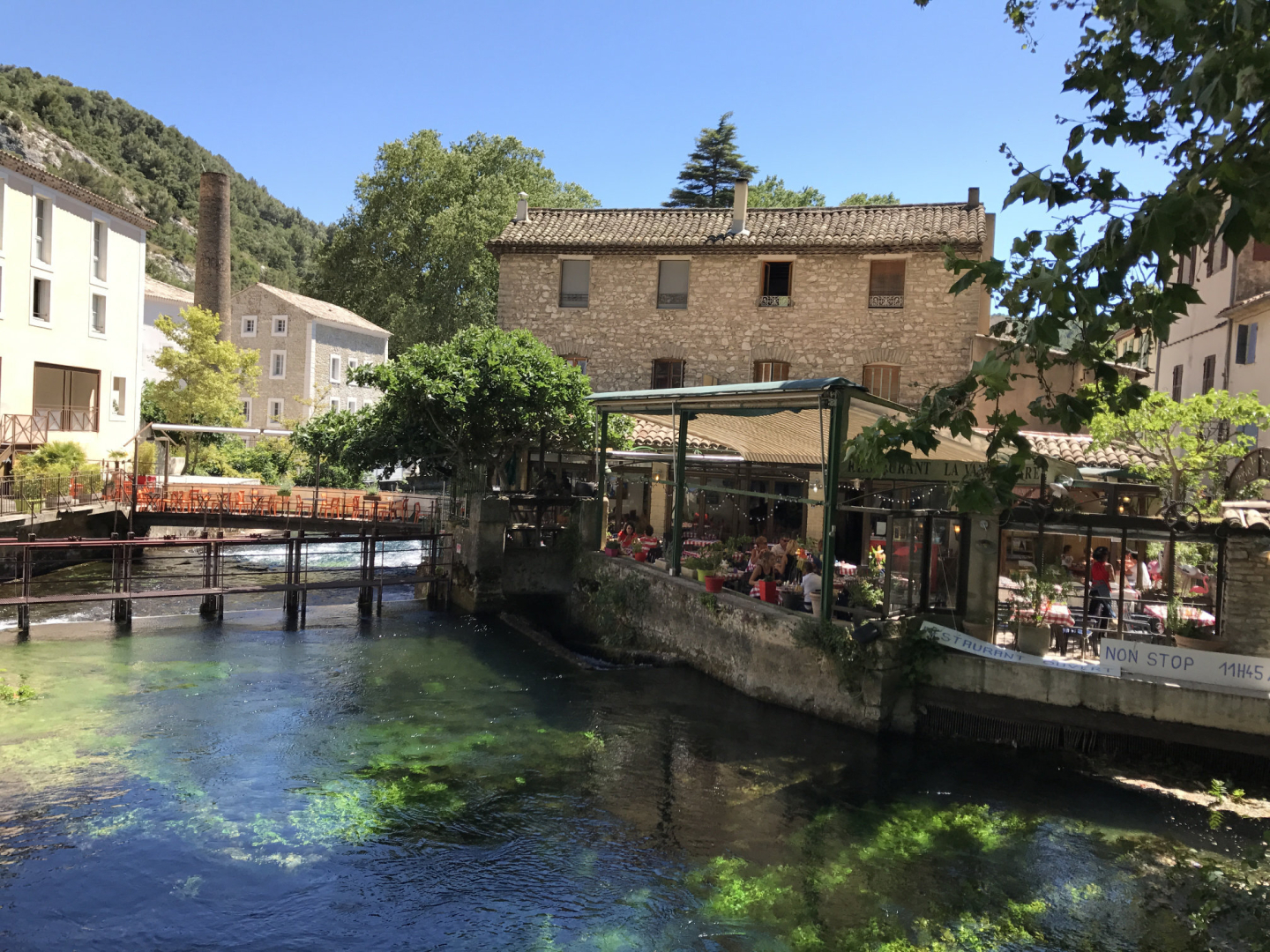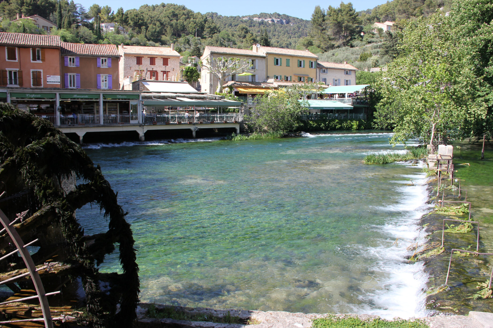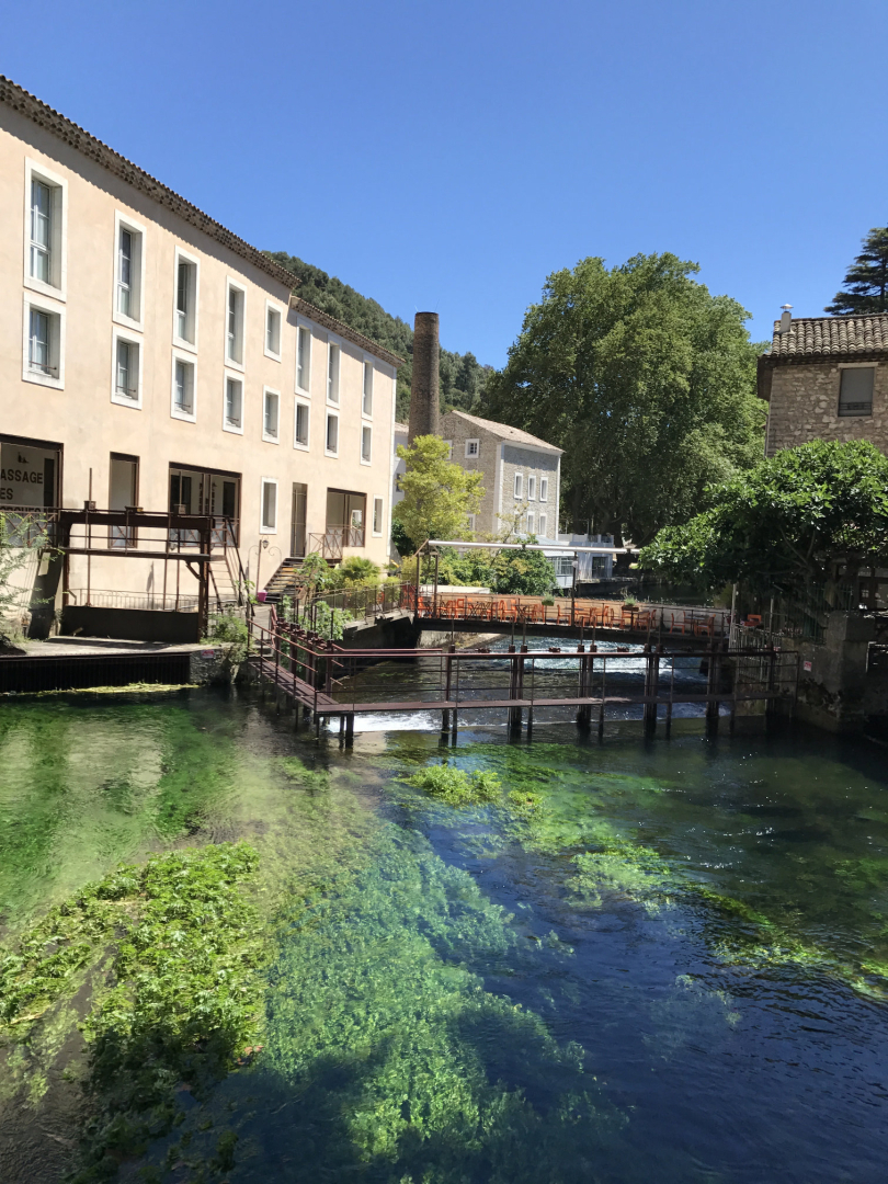 A vida por aqui sempre girou em torno do rio Sorgue. Já no século XII, quando a cidade começou a tomar forma, o rio se dividia em vários braços que cortam o centro histórico como se fossem ruas líquidas. A água não apenas moldou a paisagem: ela garantiu prosperidade. Durante séculos, moinhos e pequenas fábricas aproveitaram a força do Sorgue para movimentar a produção de lã, seda e papel.